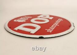 Plaque émaillée avec relief pour les Shampoings Dop. 30,6 cm de diamètre. Petits défauts d'émail visibles sur le contour. Plaque émaillée originale des années 60/70. Tôle, affiche ancienne, pub, rétro.